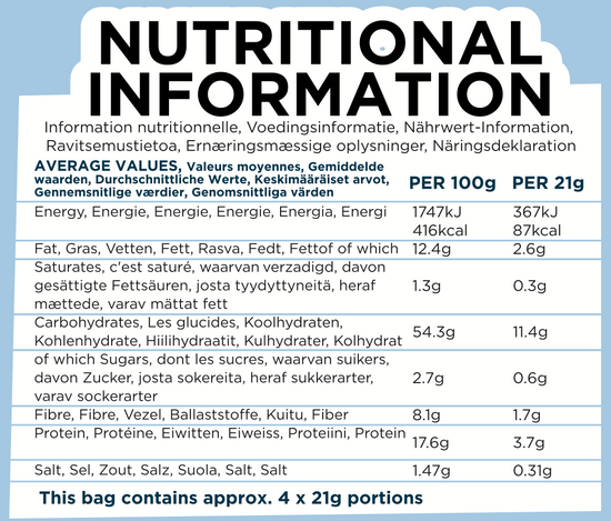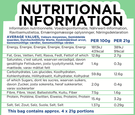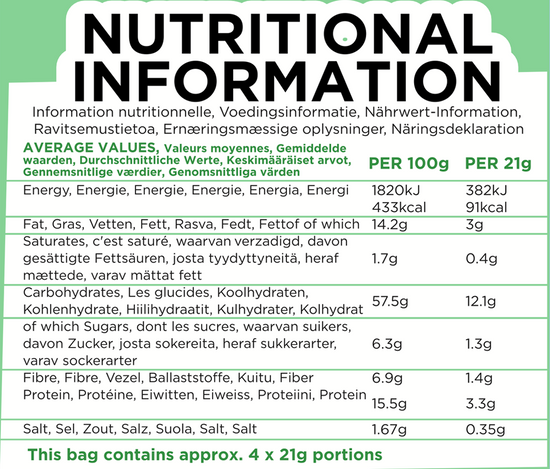 Soya Flour (18%), Potato (16%), Tapioca Starch, Rice Flour, Sunflower Oil, Green Split Peas (10%), Black Bean Powder (10%), Maltodextrin, Salt