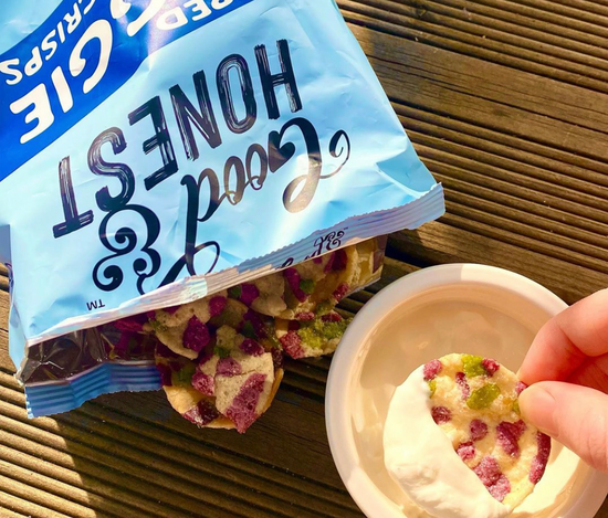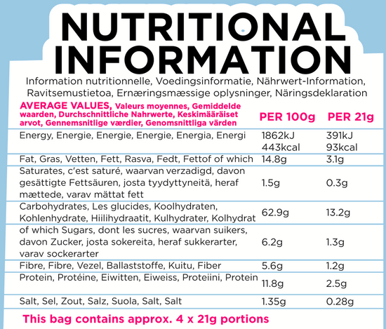 Rice Flour, Chickpea Flour (23%), Green Split Peas (14%), Sunflower Oil, Tapioca Starch, Sugar, Purple Sweet Potato (3%), Cane Sugar, Yeast Extract, Salt, Onion Powder, Spices (Ginger, Cayenne, Aniseed, White Pepper), Tomato Powder, Colour: Purple Corn Extract (E163), Garlic Powder, Acidity Regulator: Citric Acid, Basil, Natural Flavouring, Colour: Paprika Extract)